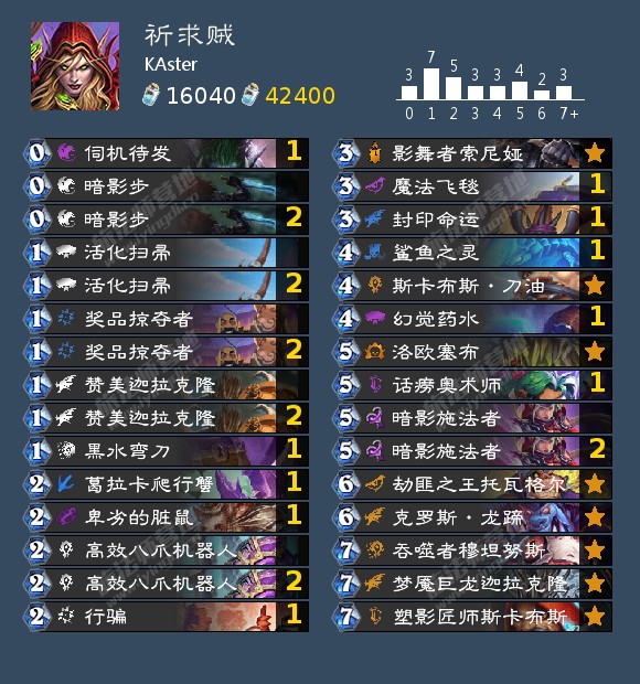 祈求贼的特点在于跟班获取资源点,所以携带了多个回收效果牌,配合魔法飞毯打出中期的优势,影武者索尼娅加活化扫帚也能重复利用资源。新卡话痨奥术师作为中立的亵渎,可以说是盗贼的第一解了。