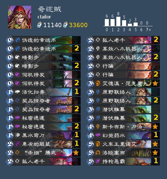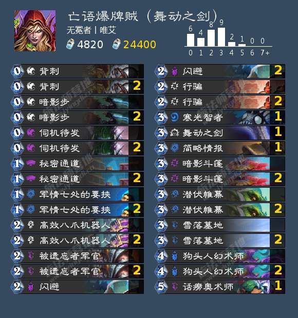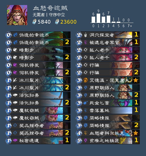 狂野盗贼三刀客之一,简单粗暴的卡组,上手简单深入则需要看卡组的卡来进行一个大局观的分析。根据孤城本人说对阵萨满和奇数猎为大优,但是完全打不过海盗战。
