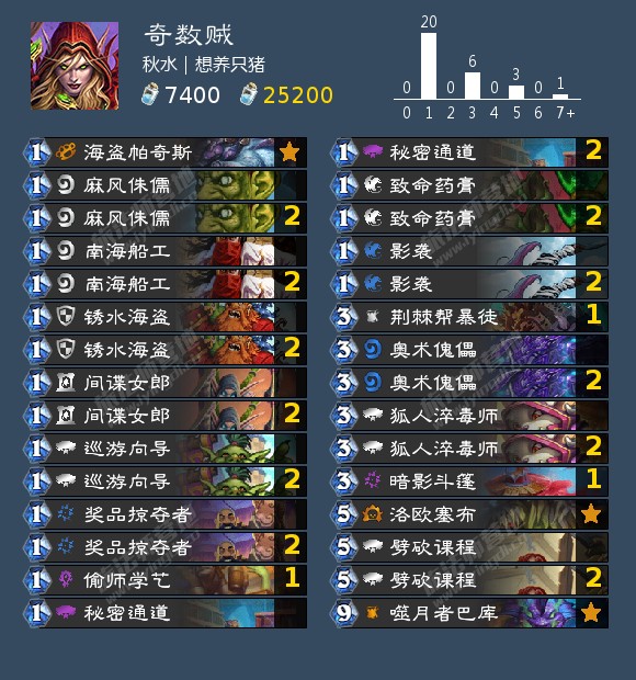 来自【秋水|想养只猪】的奇数贼,玩家【无冕者丨皇珈孤城】用这套卡组在狂野前十进行划水。