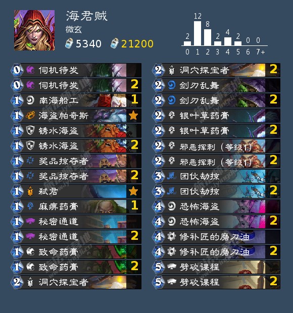 狂野盗贼三刀客之一,一套很标准的海军贼卡组,海盗和弑君的配合可以将进攻性拉满,因为放弃了目前环境中弑君贼都会带的暗影斗篷等针对卡,牺牲了劣势对局的胜率换取在优势对局中能更加优势。