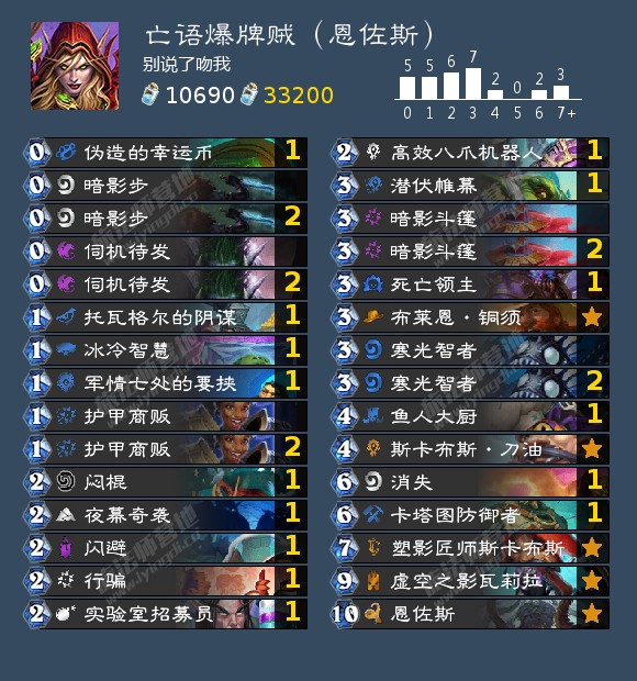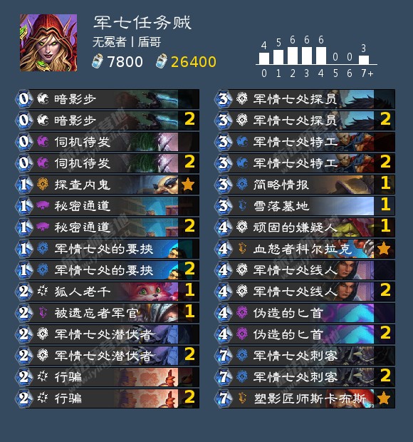 喜获亡语体系新卡的潜行者在标准模式中也可以玩起亡语贼了,被遗忘者军官自带亡语可以触发暗心贤者的效果,很自然的带上了一费优质随从间谍女郎。低费亡语采用了蛛魔之卵来配合亡语体系的触发获得场面,在拥有雪落墓地的效果下,能够触发的效果获得资源更是可观。