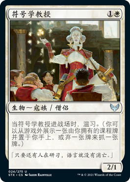 这套牌已经有很多2费人了,但是在长盘的时候你肯定会希望有更多额外价值的生物。符号学教授就是个有趣的选项,唯一的问题就是课程牌都比较弱,因此你也不会获得很多的价值,身材也不行。