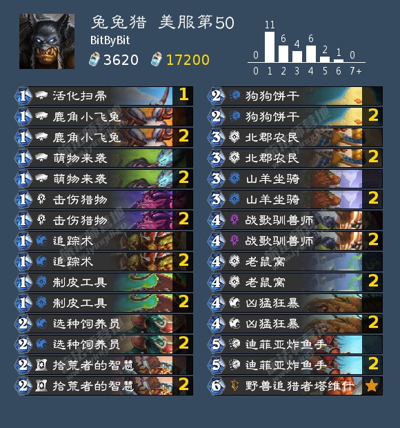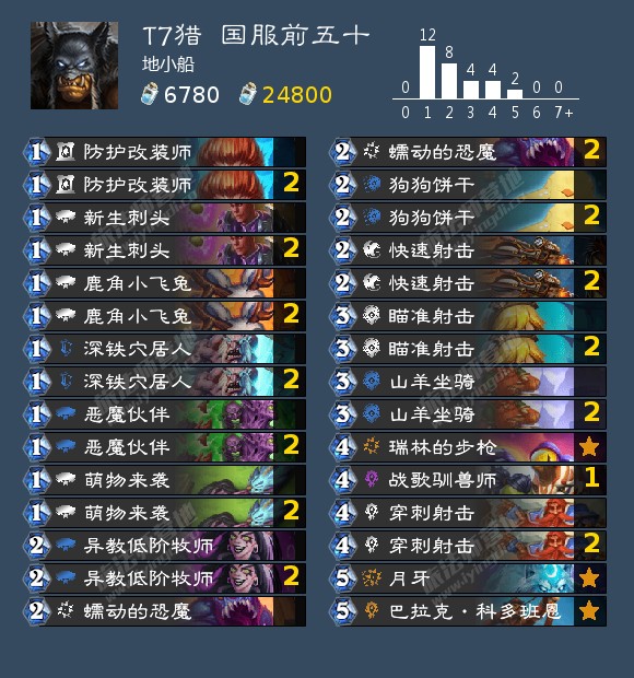 T7猎在新版本也只收获了深铁穴居人这一个可用新卡,所以整体构筑与上版本区别不大。当前版本的T7猎可以分为两个流派,其主要区分标志是是否携带犀牛。不带犀牛的卡组更加看重站场与前期场面压力,犀牛套在中期可以打出够高的伤害,但是前期没有恐魔之类的buff、中期没有月牙之类的强站场。所以前者节奏卡组内战中表现更好,但是面对熟练度较高的玩家所使用的组合技卡组时后者更好,具体作何选择还需要结合环境。