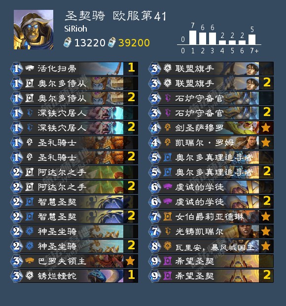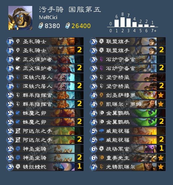 节奏型骑士是新版本的隐形赢家。石炉守备官可以有效润滑骑士的前期进攻节奏,堪称骑士新版本的最大惊喜。与其他buff流卡组相比,骑士的优点在于它不仅可以让穴居人获得身材上的成长,还可以给它贴圣盾,所以更难处理。光铸凯瑞尔则是骑士克制组合技卡组的另一个法宝,如果可以逼出猫头鹰术的罗姆或者吸血瞎的多个工匠,不可撼动之物或许真的可以让骑士变得不可撼动。不过骑士卡组的抽牌依旧不能算快、整体也依旧笨重,不可撼动之物虽然强大,但是终究是把刀,一个软就足以解决问题,这也导致了骑士虽然变得能玩,但也只是能玩而已,想要重铸贫瘠之地初期的荣光目前看来不太可能。