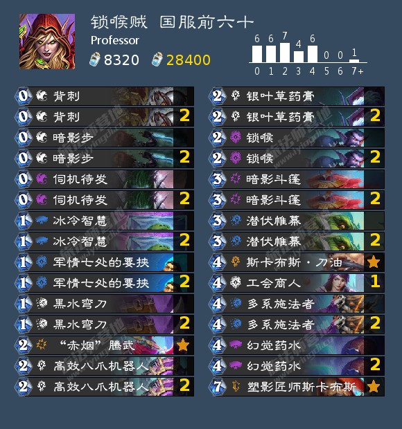 在锁喉削弱之后的那一期盘点中,我说了锁喉的削弱最大的影响其实是影响了锁喉贼的节奏与速度,但塑影匠师斯卡布斯弥补了这个问题。掉节奏以至于给了进攻卡组机会?没关系,一个消失直接买两个回合;斩杀线降低以至于斩杀所需法强更多、费用更多所以更慢?没关系,技能一按直接伺机待发,还是可以减随从费用的那种。在这一个“保姆级”加强之下,锁喉贼直接重回巅峰。在构筑上,我认为锁喉贼的最优28张已经确定,那就是文中的“模板卡组”,最后两张牌也是针对卡——携带锈烂蝰蛇是为了软掉不可撼动之物,也可以进一步强化对术士的优势,但是因为锁喉贼过牌速度实在是太快了,所以不用满编,因此另一个卡位可以给第二个伺机待发以进一步优化卡组节奏;携带异教低阶牧师则是为了针对超凡德,考虑到德鲁伊开超凡的时间一般较早,锁喉贼理应满编以提高用小塞布卡住德鲁伊的概率。至于防护改装师……我觉得现在想在被穴居人逼得武装到牙齿的组合技卡组和被组合技压榨得前期进攻能力拉满的快攻和节奏卡组面前保住联络人有点难……再加上锁喉贼已经有很多很多可以扎八爪减费的牌,伺机待发这种可以无前摇起节奏的牌却又嫌少。所以,再见了,老师!