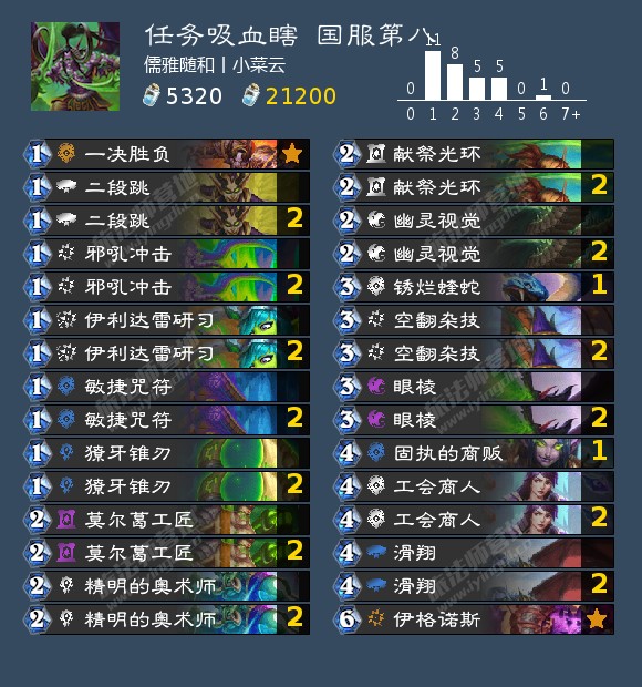 目前天梯上最为主流的DH卡组是与上版本相比一张不改的任务吸血瞎。与环境中的其他组合技卡组相比,任务吸血瞎的速度不算太快,但它毕竟有滑翔,面对锁喉贼、决斗法、猫头鹰术等卡组时完全可以对对手造成毁灭性打击,所以足以立于天梯。