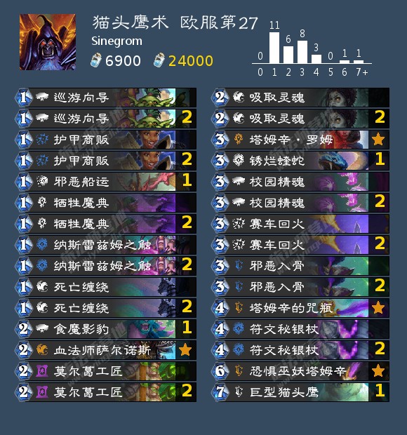 猫头鹰术的构筑也基本确定了下来,整套卡组值得一聊的也就是最后一张牌了。目前常见的选择有第二张组件、第二个食魔影豹、防守卡以及内卷卡。带第二个猫头鹰主要是为了提高在前面抽到猫头鹰的概率,而且也可以防744。至于带第二个邪恶船运,和带第二个食魔影豹的理由差不多,主要是强化卡组的抽牌能力。可选的防守卡有邪恶入骨、皇室图书管理员和砸场游客,邪恶入骨针对的是节奏卡组、快攻卡组较多的环境,后两者则主要是针对圣契骑以及穴居人卡组。内卷卡则指的是锈烂蝰蛇和吞噬者穆坦努斯,前者在术士内战中效果极佳,软掉对面一把刀可以**提高自己的胜率,而吞噬者穆坦努斯则意在针对所有组合技卡组,既是对上锁喉贼和决斗法时的“赌命选择”,也是内战时的内卷神器,在对上OTK冰萨时也可以进一步增大胜算,但是问题在于这么个7费卡确实有点卡手,在术士前中期需要卸牌的时候更加明显。