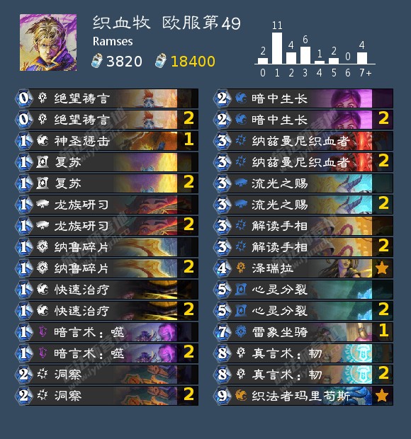 各类刷刷牧在新版本重获新生,主要原因是牧师也可以给穴居人套上圣盾,而且在纳兹曼尼织血者的加持下,很容易做出高血的复杂场面,对于环境中某些卡组(如猫头鹰术、超凡德)来说很难处理。因为与去年年末的环境定位不同,现在的刷刷牧其实并不一定要携带塞泰克、开赛集结等“奇迹体系”单卡,直接纳兹曼尼织血者和穴居人丢下去开始刷就完事了。新卡方面,当代最强Buff受体深铁穴居人肯定是这类牧师的可带单卡。暗言术:噬以及祝福作为相对低费的buff也有着不错的相性。