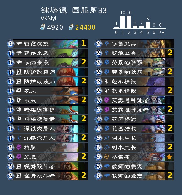 -雷霆绽放、劳累的驮骡*2、钢鬃卫兵*2、花园猎豹*2、格雷布、教师的爱宠*2;