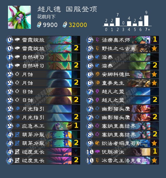 新版本职业卡对于超凡德的补强只有野性之心古夫,超凡德能够成为环境中一股不可忽视的力量,除了组合技卡组较多、环境很好之外,内因在于两张中立卡:话痨奥术师以及冰雪之王洛克霍拉。前者是德鲁伊苦苦期盼了一年的AOE,虽然理论上来说一张卡并不能改变超凡德面对快攻时的劣势,但是在实操中它的效果其实相当显著;冰雪之王洛克霍拉则进一步增强了开超凡回合的生存能力,88风怒如果站住的话也有很强的场面压力。在我看来,这张卡完全可以取代闪金镇豺狼人在超凡德卡组中的位置。