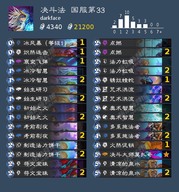决斗法收获的新玩具是大帝见了会沉默·索瑞森见了会流泪·不转不是655,又名法力虹吸。现在主流的决斗法中有28张牌是确定的,剩下的两个卡位主要用来塞针对卡,如果术、骑比较多可以带锈烂蝰蛇,穴居人比较多可以带衰变飞弹或者火焰促销,中速比较多可以带冰风暴。如果不想做针对的话也可以带个炽热连击以润滑前期解场并提高斩杀线。