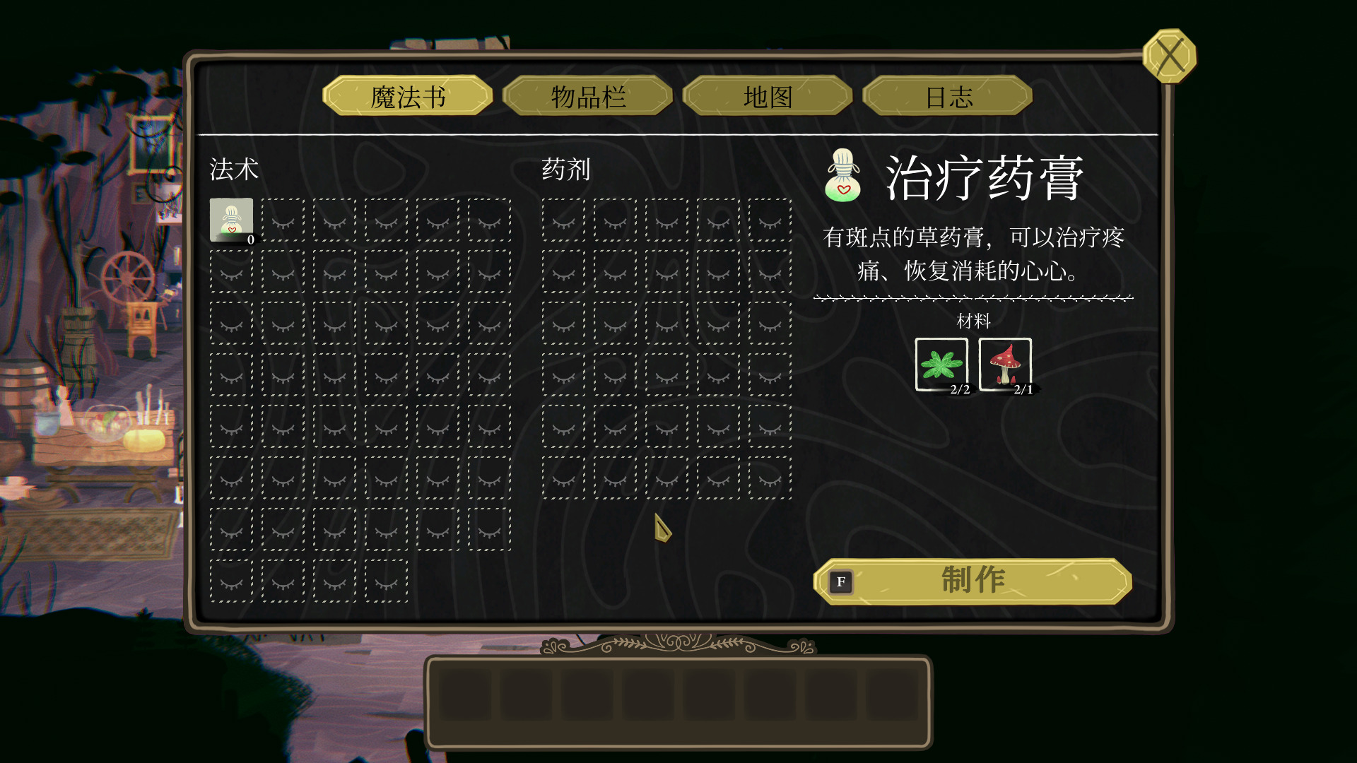 既然配方没了,那就想办法出发把它们一一补回来了吧,当然在这之前,睡了太久的女巫婆…小姐得先做个治疗药膏治治她那不中用的身板。
