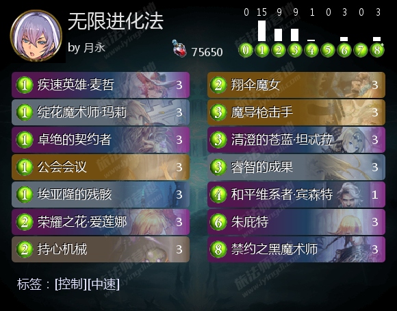 其中回血收益为主要收益,例如公会会议,翔伞魔女,朱庇特。因此,进化法在进化展开时,拥有大量的爆发性回血,爆发力不够的对手,几乎难以通过分段斩杀的方式战胜进化法。而在无限制中,进化法可以通过挂土之秘术体系的禁约之黑魔术师,获得减伤能力,以此对抗OTK组合技思路。由此可见,进化法具备“控制”元素。