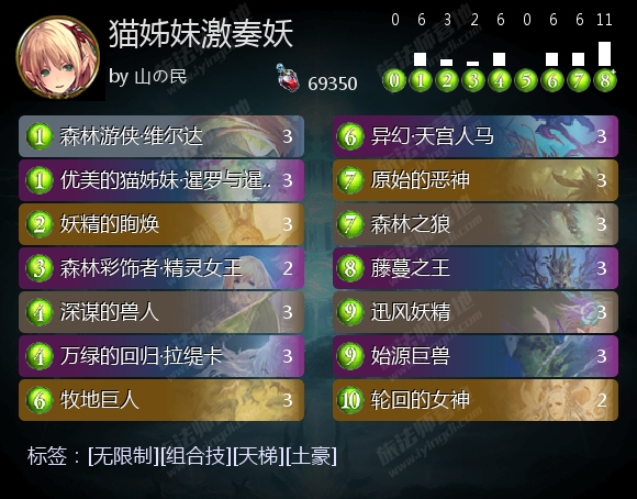 但与指定不同的是,无限激奏妖的激奏浓度更高,可以投入深谋的兽人、森林之狼、始源巨兽(或森之闇念·莱昂内尔)等指定不可用的激奏牌,因此更容易将激奏数堆到10次以上,依靠爆能维尔达打出不逊色于拉缇卡+眴焕的斩杀。此外,无限天梯中出没的守护随从比指定更少,这进一步增加了爆能维尔达的实用性。