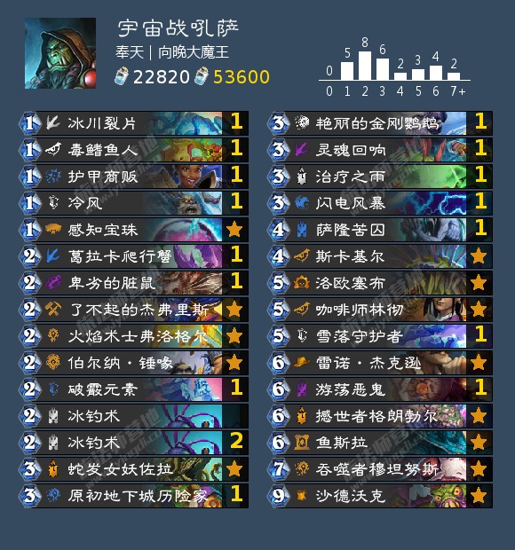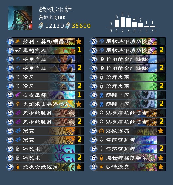 来自营地老哥BIR的一套战吼冰萨。卡组携带大量冰冻,对阵站场型卡组大优,全留过牌即可。