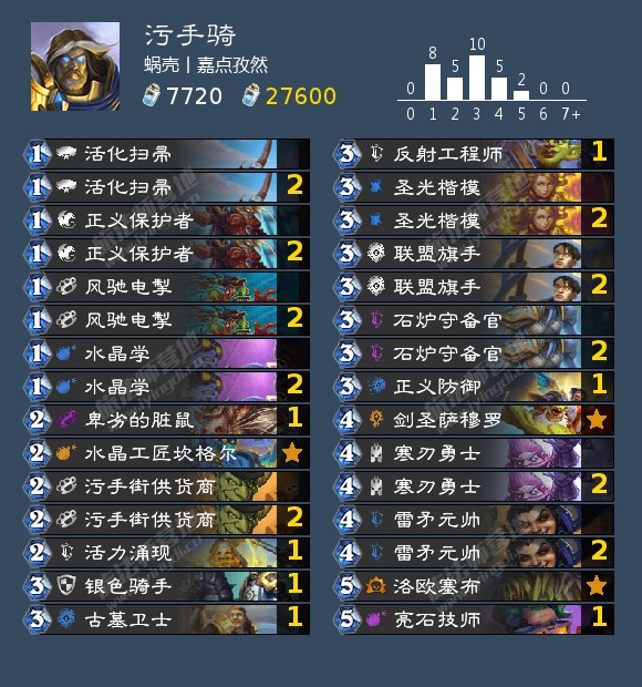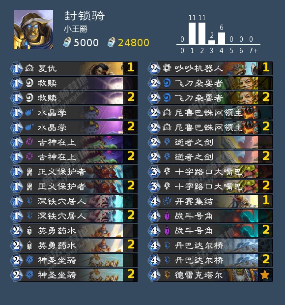 6.圣骑士:很少的对局,主要有厕所骑(局势)和污手骑(大优)厕所骑我们解牌很多,及时解场防止被卡节奏,被卡住一下感觉就没希望了主意防奥秘,污手骑我们解牌很多,且不像厕所骑那样有很多干扰,容易拿下。