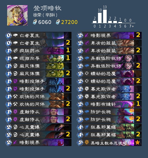 来自徐荣的一套登顶暗牧,他登后被挤下来了,然后又登了,可见卡组值得信赖。