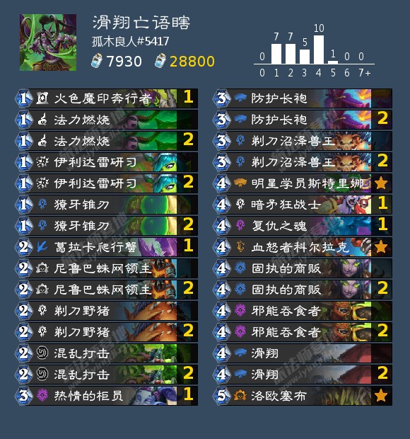 复仇之魂作为优质的随从过牌,同时契合了亡语体系和流放体系必带。但是四费的曲线在节奏中,往往意味着单回合内拍出,在现有曲线下,往往会挤占一个回合。在实战中,极少出现天胡的右侧流放,即使出现了右侧流放,也可能导致剩余水晶无法进行其他节奏强化,依旧是亏的。该牌的使用方式是利用之前的若干回合,腾出左侧流放。根据现行狂野游戏的终结速度,回合数不足以支撑对两个复仇之魂同时进行腾空左侧流放。因此带一张,同时也匹配了亡语随从数量。火色奔行者略亏,但是同时兼备低费曲线流放体系和过牌的作用,带一张。伊利达雷研习神牌,既可以补充资源,又可以进行曲线的润滑,同时在特定对局下可以加快关键牌学员和滑翔的出场时机。