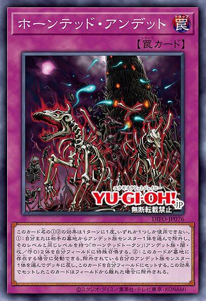 ①:从自己或者对方墓地选1只不死族怪兽除外,在自己场上把持有和那个等级相同等级的2只「ホーンテッド衍生物」(不死族·暗·攻/守0)特殊召唤。