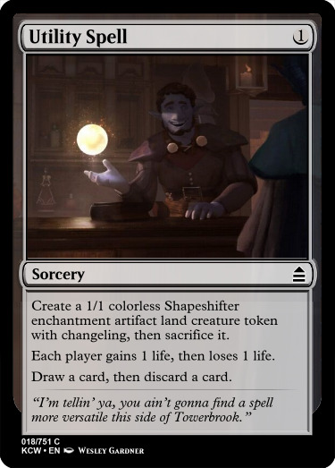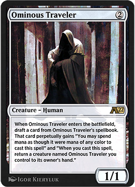 恶兆旅人:(法术书:控念吸血鬼、名流吸血鬼、溪堡血贼、伐肯纳死斗士、狼族遭黜人、嚎群笛手、怖狼首领托瓦拉、显贵游魂、船难筛寻灵、覆铁精怪、鹭佑游魂、瑟班大尸鬼、墓躯斗士、无头骑手、刀扎尸嵌 )从风味儿上来讲我很想知道这位旅人都经历了什么,身为一个人类,依尼翠的妖魔鬼怪见了个遍,而且还见过一位传奇狼人。但是从实用上,这牌虽然能让你出了法术书的牌以后回手再赚,但他给你的这些东西毫无互动可言,我想不通一会出个狼人一会出个精怪对一个生物套牌来说有什么好处可言。
