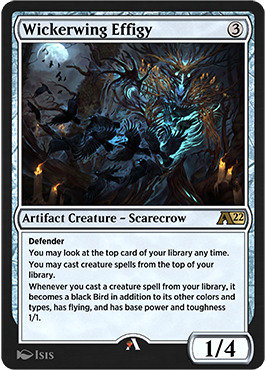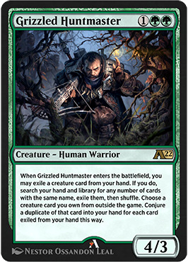 风霜猎师 :怎么说呢首先我要表扬这牌,因为它证明了我比好多母语者阅读理解还要好。简单来说,它的效果就是把你手上的某张牌和它的同名牌都换成一张你备牌里的生物牌的复制。不是很确定为什么他还要说你可以把牌库里的同名生物牌都放逐,我想可能是为某种尚待开发的组合技做铺垫,比如你可以往牌库里塞满执着诉愿人然后一下摘干净,不过这样做的目的在哪就不得而知了。这张牌首先优势在于身材不错,费用也比较低廉。他给你一个类似于卡恩的工具箱效果,需要什么可以找什么。另外因为是电子判定,所以这牌绕过了“向对手展示”这个步骤(至少牌面上没有写),所以对手是不知道你找了什么牌的。很适合带军伍的绿色系中速套牌,你可以把一些厉害但是军伍翻不出来的东西,比如说寻水兽什么的放在备牌,然后靠他换进来,因为是直接给复制品,也不用担心像卡恩那样从备牌用一张少一张。