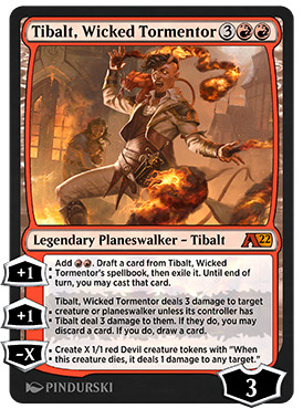 恶毒拷问者提勃:(法术书:受链蛮魔、断符魔鬼 、收成节破坏魔 、锻炉魔鬼 、浩劫小丑 、地狱骑士 、噬踵邪鬼 、燃沥青魔鬼、纵恶魔鬼 、怨毒捣乱魔 、提勃的躁鬼 、火炬邪鬼 、硫磺破坏魔 、魔鬼造孽 )最强旅法回来了,但是我还是更希望他好好待在凯德海姆。5费3豆旅法上一次还是护兽薇薇安和战士诗人华特莉,但是这两位都好歹能甩个3/3出来。第一个异能发现的牌里有一半都不能用加的那两点红出,而能出的那一半都弱的不行,第二个异能也不一定能去除,对手忍个闪电击就过去了。第三个异能...还不如焚毁房屋,至少还能愤一下。
