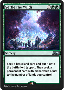 定居荒野:类似栽培,第二张牌不是给地而是一个永久物。不过这要求你牌库里面有各种费用的永久物,否则一不小心这牌就变成一个很差的徒长。
