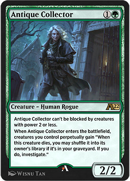 古董收藏家:让你的生物可以死了再利用,配合凶犯通缉令蛮不错的。不过因为本身进攻性太差,很可能会出现在沾绿生物套牌的备牌里,而不会进主。