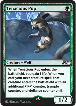 这只小狼想要加入到18线套牌豆套是很容易的,它能触发回血放豆,也能自己放豆,还能给下一个生物同时放上两个异能指示物。一回合小狼二回合就可以获得4/5践踏警戒的蜿蜒缠蟒了(而实际情况是蜿蜒缠蟒只被加到了3/4,我不知道这是bug还是我对规则的理解有问题)。这个场面听起来是很美丽的,然而问题显而易见:那又如何呢?豆套在史迹里虽然能造几个大人,但没有僧侣套的人大,也没有妖精铺得广。这牌最需要的一张牌——自行弩炮也不会出现在史迹(因为还有白神在)。等MTGA修好我一定会组一套小狼豆套在金段位混一混,但我很确定它不会带来什么特别大的区别。