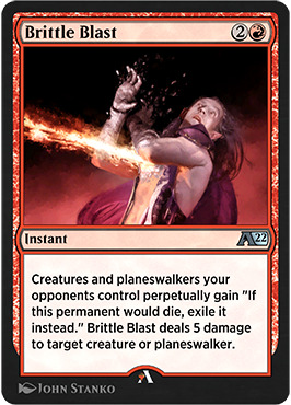 脆裂冲击:限制好牌,不过炼金又没有好牌,给对面的生物和鹏洛客都贴上死去后放逐看上去也没有什么特殊的互动,如果要是连地都能影响的话,那我觉得和索蓝覆亡录配合一下,否则的话我们不会在构筑里用一张3费打5.
