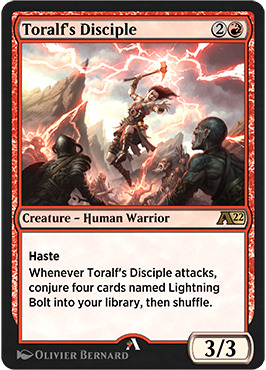 托拉夫的信徒:你还记得托拉夫是谁吗?是这位:怒火神托拉夫。这牌蛮有意思的,身材不错,有敏捷,打一次就往牌库里塞一组闪电击,这个效果可能是红烧希望获得的,但这不解决根本问题。我的理解是她可能比较适合加入实验性狂乱的红烧套牌,踢两次给牌库塞几组闪电击之后,狂乱连营的机会会变高。不过现在带实验性狂乱的红烧少之又少,这张牌不知道可不可以将狂乱盘活。