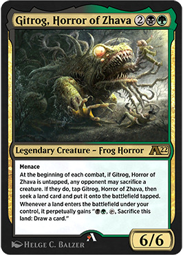 扎瓦惧蛙:我其实没有特别理解它和噬人蛙怪(The Gitrog Monster)是什么关系,它俩虽然类别一样,但是长得有点差别,也可能这个版本是受到奥札奇影响的蛙怪?这张牌身材不错,异能也挺赚的,非常适合在黑绿中速寻找职位,也肯定可以在争锋里出场。不过缺点显而易见,人家能横你,所以在防守端它没那么优秀,而黑绿中速应该很需要防御前期敌人的攻势。很令我纠结的一张牌。