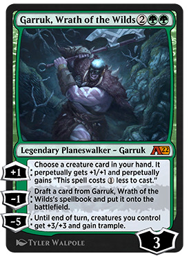 荒野之怒贾路:(法术书:苔皮猿牦、森林拂行兽、姆拉撒嚼根兽、凶暴掠狼、凶猛幼狼、瘟疫狼、贾路的反抗、晨行麋鹿、奈西安角虫、据地镰刃猫、掘菌野猪、警觉欧卡皮鹿、怖鼠群落、树皮巨魔、幽暗地域石化蜥蜴 )首先这个-5和召兽使贾路的效果完全一样(但是费用多一点忠诚指示物),这个设计也太无诚意了。+1异能没有什么特别的吸引力,-1比提勃那个强太多了,至少是直接放进场,但是这里面屁股最大的就是苔皮猿牦,是个2/4,其他基本上都不如以往贾路造的3/3野兽。绿色生物套牌应该不会用这样一张牌。
