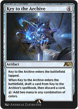档案库钥匙:(法术书:神日迫临、审判末日、时间弯曲、反击咒语、邪魔导师、送终刀锋 、闪电击、索求初婴、克洛萨之攫、再生新芽、灭除火花、电解、成长涡旋、闪电螺旋、腐烂)为史迹无色ramp量身定做的一张牌,法术书里面的内容强劲,但缺憾不能单纯赚一张,要弃一张作为代价。自身横进也比晶石档案逊色不少,不过看在能找审判末日、邪魔导师、时间弯曲这些牌的份儿上,如果我玩无色ramp,会考虑带两个这个下两个晶石档案。