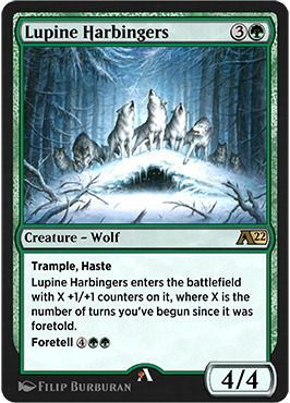 先兆狼群:想要有预示的效果就得6费出,而6费出一个大哥在史迹的标准看来太差了,如果杀戮暴霸龙和阿瓦布照管人这样的顶级6费绿色生物都不能找到自己的一席之地,这群狼也肯定不行。而单看生拍的效果,444敏捷践踏有沃文森异兽,比这个厉害因为能翻面。