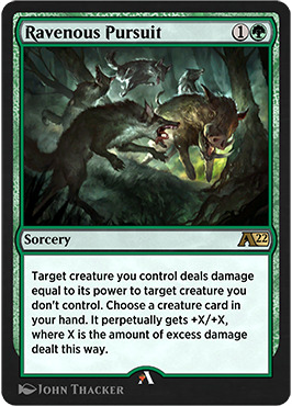 贪食追击:这牌在预览时的呼声很高,不过冷静下来看一看,这牌是个法术,所以拿来和多密的伏击来比较是很合适的。那么它真的比伏击强吗?我们更希望在快攻套牌中拥有一个马上就增大场面的效果,还是一个并不稳定的(你得造成过量伤害才行)、更存更有威慑力的效果呢?这无疑是一张好牌,但和同类型的牌来比,我没觉得它特别有优势。