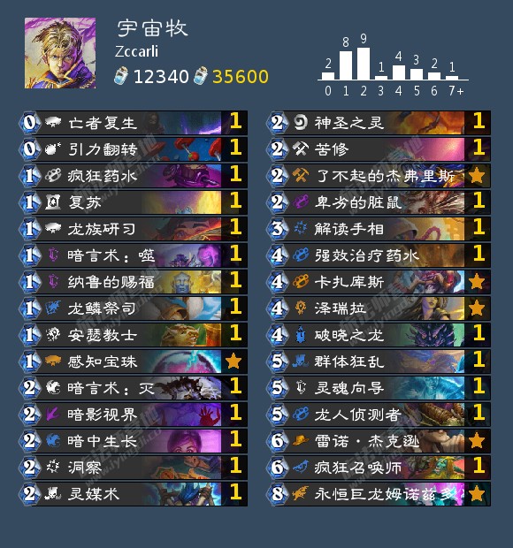 虽然原帖中的很多combo都是真的用不上的(笑),但这一套经过实践之后发现可行性极高而且作为牧师难得的终结比赛的手段来使用。在这套宇宙牧中用引力翻转代替了祝福,用从30血斩杀降低到了28血的代价换取了不需要任何减费的十费斩杀。