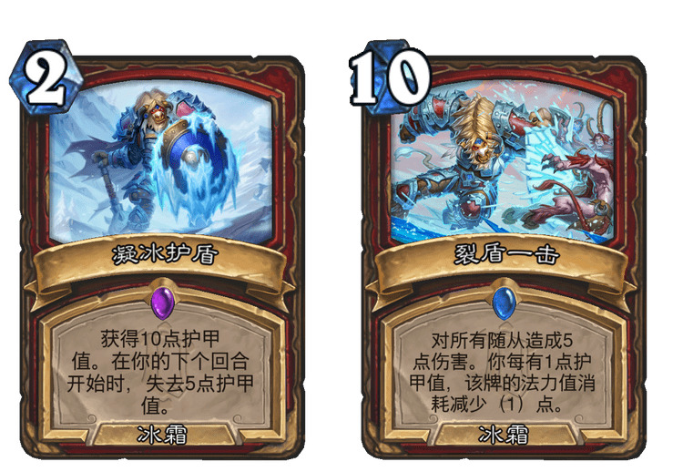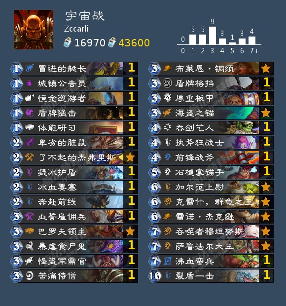 由于我对后期战士的体系了解的不够彻底,导致这套牌在成型之前其实做了很多调整。其赢法有别于传统后期战士,如果叫我用一个其它职业来类比,我会说它更像一套盗贼的变速卡组。斩杀手段在于奔赴前线,冒进的艇长/暴虐食尸鬼,布莱恩·铜须,血誓雇佣兵和加尔范上尉的九费三十六点斩杀。请不要拘泥于这是一个需要五张key牌的combo,其所有牌无论面对快攻或是后期卡组的单卡作用都是很强大的。另外,这副牌内有八种不同的过牌手段形成的过牌链,例如城镇公告员抽执斧狂战士或者石槌掌锚手,执斧狂战士再抽海盗之锚和前锋战斧,加上苦痛侍僧,盾牌格挡,厚重板甲可以说完全不存在手上没有过牌的情况。这里要提几张单卡。凝冰护盾和裂盾一击的aoe大家都很了解了,我有一次在两费时直接劝退对面的暗牧。