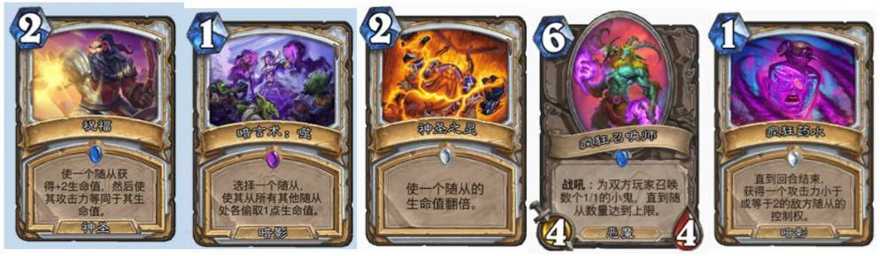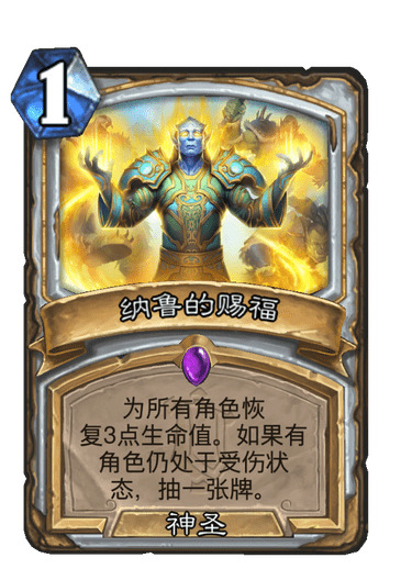 卡组大致思路是靠这套combo偷鸡赢得比赛,打快攻和一些相对薄的后期卡组可以用龙体系和宇宙的资源取胜,所以赢法并不单一。组件除神圣之灵和疯狂召唤师外可以拆掉当作解牌使用。其余配件大多走的是宇宙牧的老路。这里重点介绍一下单卡纳鲁的赐福和龙体系的构筑思路。纳鲁的赐福作为牧师的又一张过牌,其优秀程度在于本身的一费和泽瑞拉配合的五费清场。这个五费的aoe最低是全场打三,最高是四十八点(哈哈认真的吗)。