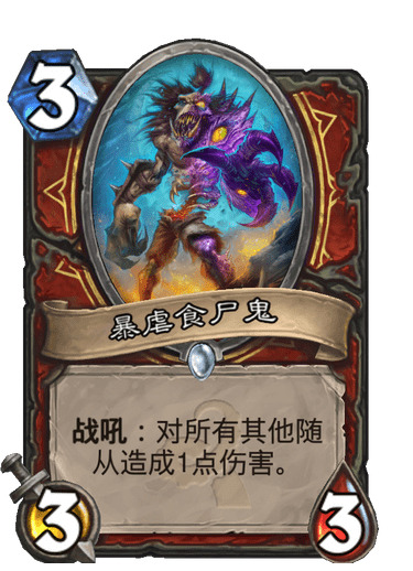 暴虐食尸鬼是老得不能再老的一张卡牌。本身3费打一站33是不亏身材的,重点是其可以作为冒进的艇长的代替打出combo,其余和冰血要塞的作用类似。