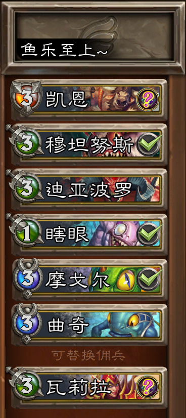 这是一套比较娱乐的鱼人阵容,作者七海千秋#51869 。我们的首发通常是“吃手手”穆坦努斯、老瞎眼、摩戈尔。后备选择最常见的曲奇、牛、菠萝。