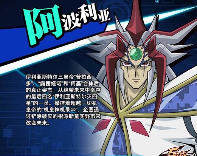 阿波利亚是绝望未来中最后生存的4人之一,为了改变未来让域将自己一分为3送到过去引出弧线摇篮。是普拉西多、露琪亚诺和何塞合体后的真正姿态,使用机皇卡组。在被杰克、龙亚和龙可联手打败之后选择相信5DS的可能性,先去挑战域让游星看到域使用的卡组都有什么卡。