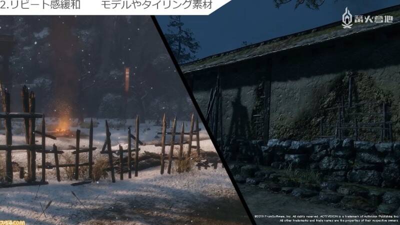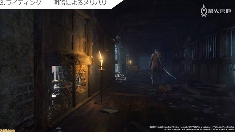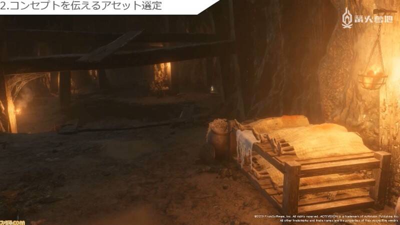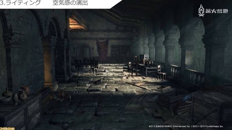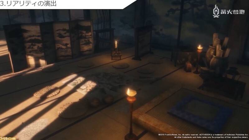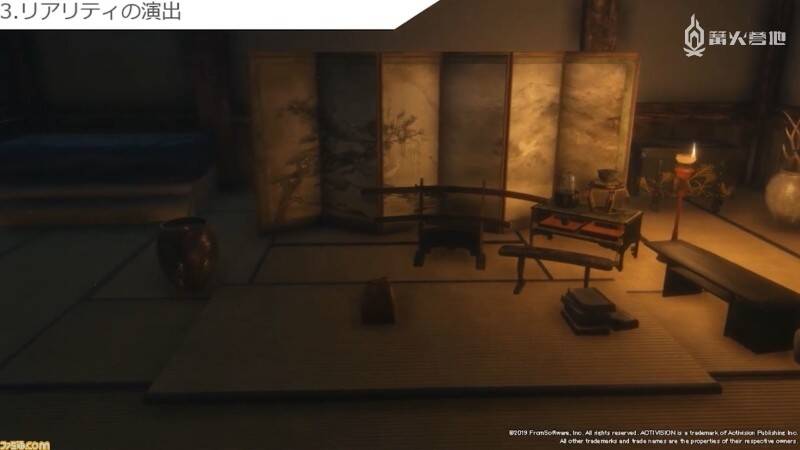 最后一个是「营造真实感」。这时画面显示的是苇名城内部。其中一个房间内放有地图和几张坐垫,让人立即就能联想到「作战会议就是在这里展开的吧?」,令画面变得更加具有可信度和说服力。