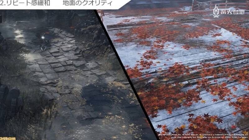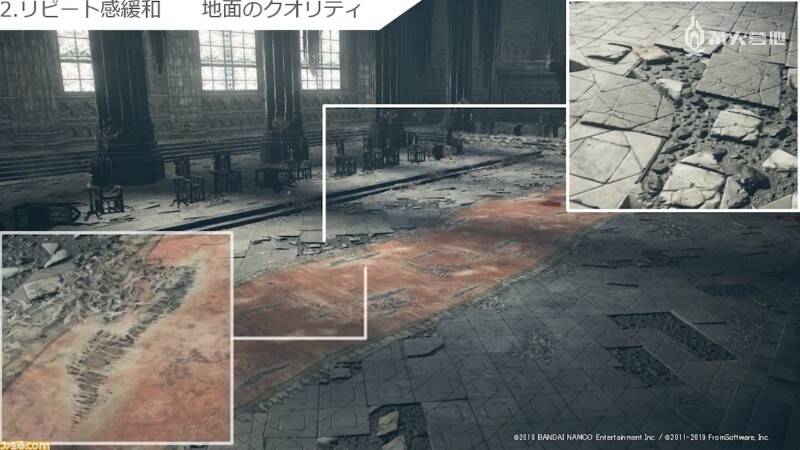 由于地面会占据一大半屏幕,因此开发团队在地表的制作上下了很大功夫。除了地砖带有破坏和劣化效果以外,还加入了布料朽化的表现效果。然而如果地图本身缺乏特点,再怎么将地表设计打磨得精益求精也无法对画面效果产生积极的影响,因此制作组通常都会加入一些比较容易让人看出变化的要素。