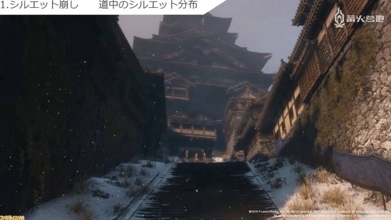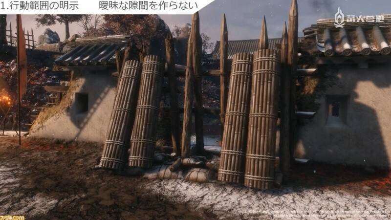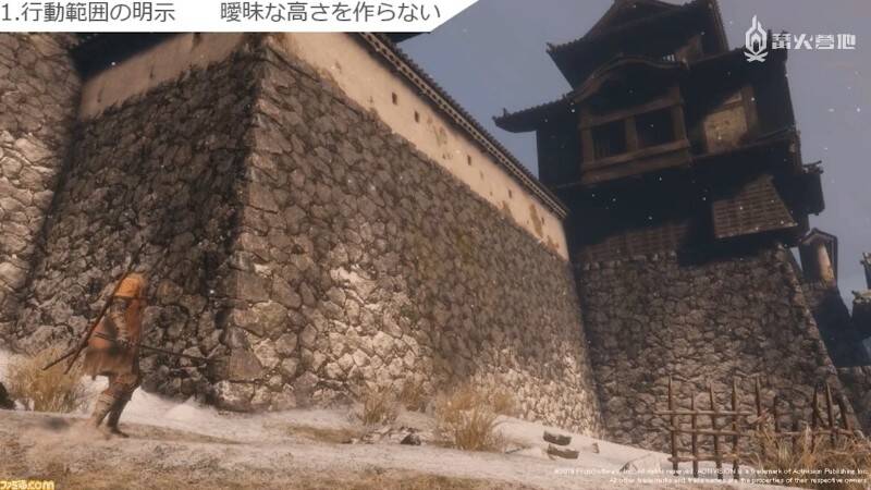 第一大要素是「明示行动范围」。《只狼》里苇名城墙的高度就明确地告诉了玩家「跳是绝对跳不上去的」。正是因为制作组对墙壁高度之类的细节非常重视,才避免了玩家因模棱两可的高度产生「也许可以」的错觉。