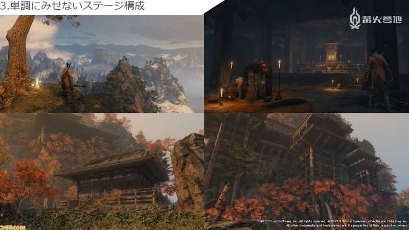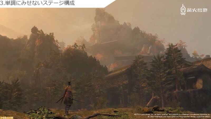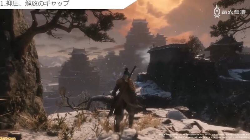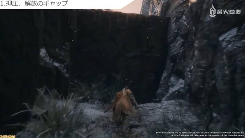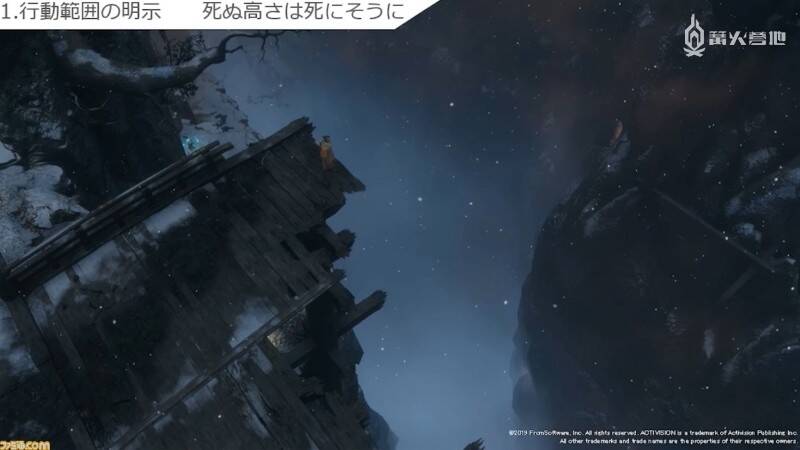 最后是关于角色掉落伤害的问题。在很多游戏里,玩家从原以为可以安全着陆的高处跳下时,不是摔死就是受伤的情况并不少见。《只狼》的制作组为解决这一问题,特意制作了「看上去明显一摔便死」的悬崖峭壁。在笔者的印象中,《黑暗之魂》系列里也有不少「看似能跳结果一跳就死」的地点,因此这一点更像是直到《只狼》才引入的独有设计理念。