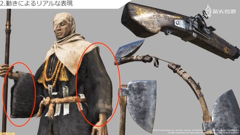 此外,制作组为实现逼真的材质贴图也下了很大功夫。举个例子,他们并没有特别执着于布料纤维的细节,毕竟玩家并不能从远距离观察到这些细节。因此制作组选择了通过设计磨破的袖子、武器把手长期使用的磨损、划痕等细节来增加辨识度和真实感。