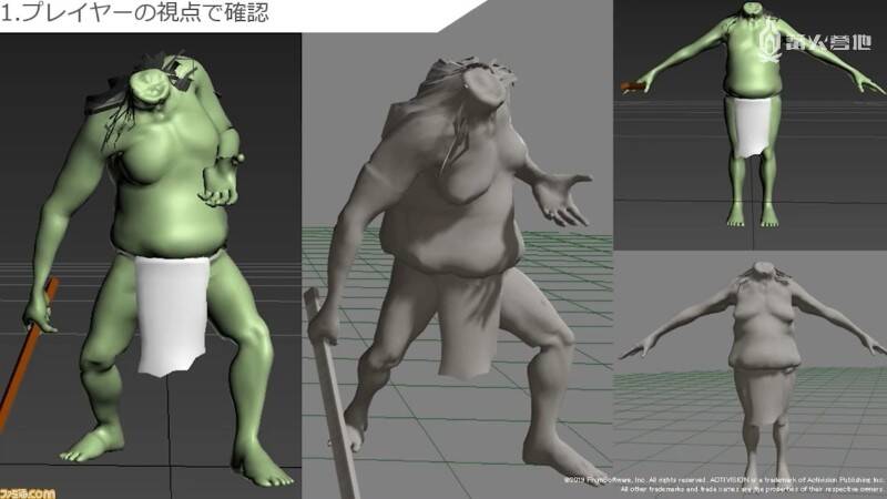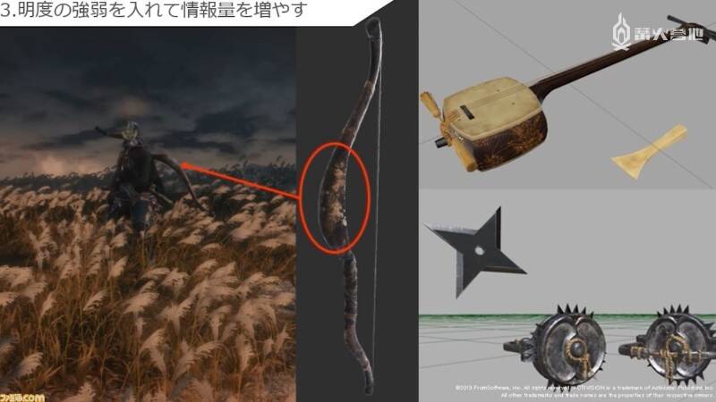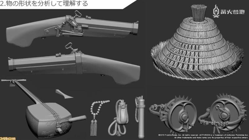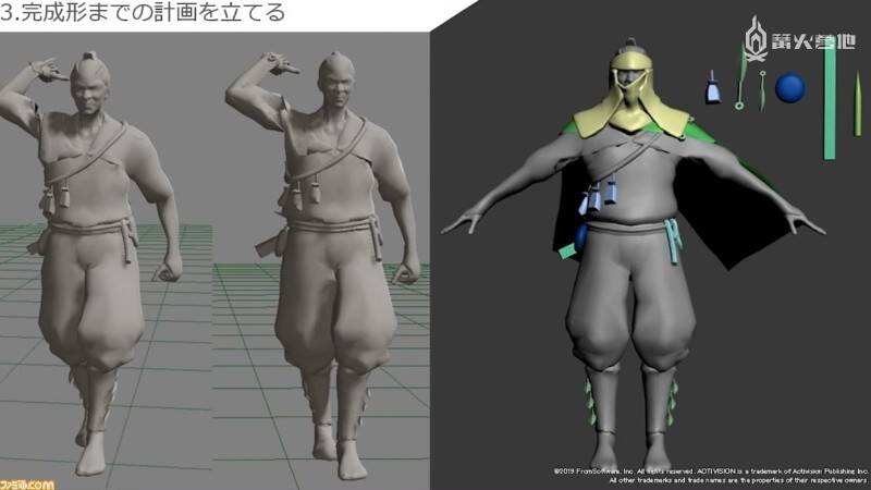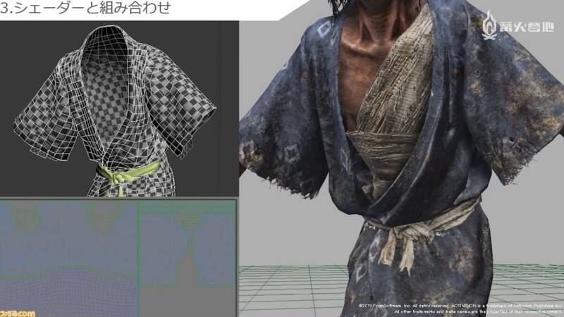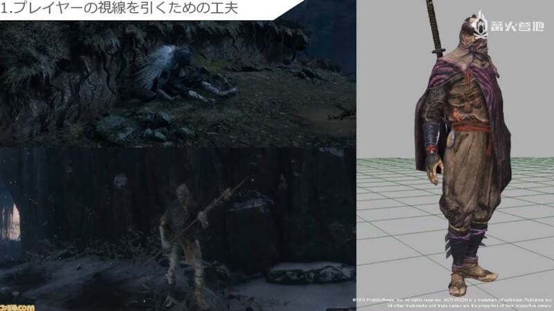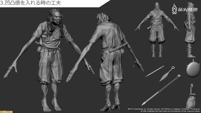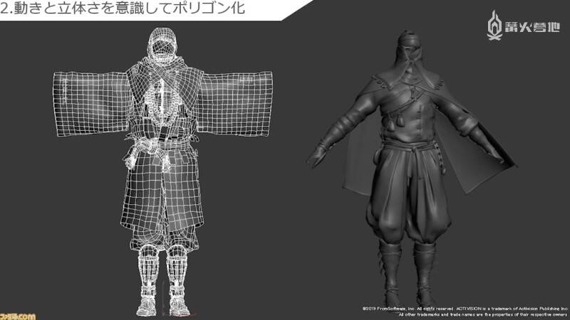 听完了立石在实际开发以及从前辈那里学到的 FromSoftware 式背景和场景的制作方法。接下来轮到末武为大家介绍角色制作部分了。角色部分的解说均以《只狼》中的模型为例,他在介绍实际制作流程的同时,还提及了不少制作时需要注重的要点。
