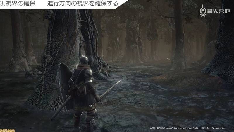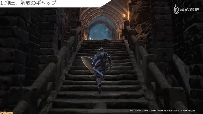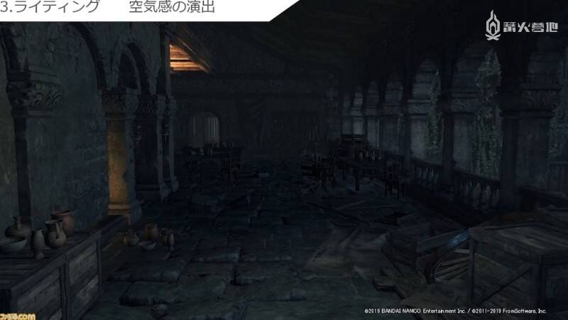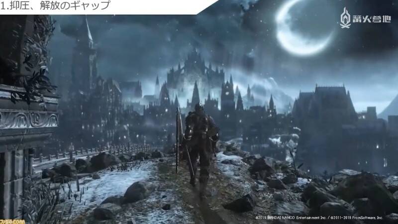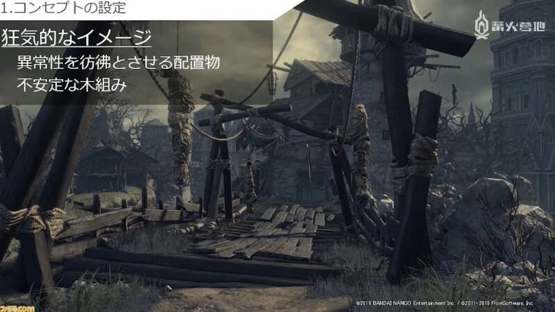 到上面为止都还只是制作组在开发时比较重视的设计理论。最后要谈的则是令人印象最为深刻的所谓 FromSoftware 视觉风格。从中可以看出为了给玩家留下难忘的体验,制作组在舞台背景制作上到底花费了多少心思。