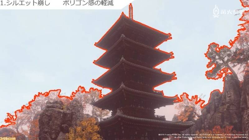 立石说第一步是要打破轮廓,减少多边形的锯齿感,这一点很重要。演示的图片是一个以五重塔为原型制作而成的建筑物。仔细观察的话,你能发现背景中的树木和岩石可谓相辅相成,使整个背景的轮廓变得更加复杂多样。因为放置直线型轮廓物体过多的话,总感觉能看到棱角分明的多边形,因此制作组选择了通过放置岩石和树木来消除以及遮挡直线的轮廓。